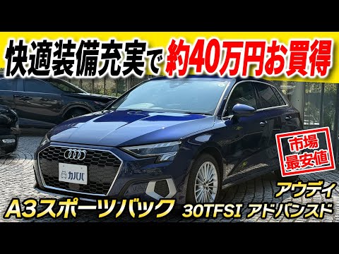 2022年式 アウディA3スポーツバック 30TFSI アドバンスト 【車両紹介】 2022年式 アウディ A3スポーツバック 30 TFSI アドバンスト が入庫いたしました。 コンパクトながらアウディらしい洗練されたデザインと高い剛性を備え、日常の街乗りから高速走行まで安心して楽しめる一台です。 搭載されるのは、効率に優れた1.0L直列3気筒ターボエンジン。7速Sトロニックとの組み合わせにより、軽快な加速と優れた燃費性能を両立しています。街中での扱いやすさはもちろん、長距離ドライブでもストレスのない快適な走りを体感いただけます。 エクステリアはシャープなLEDヘッドライトや立体的なシングルフレームグリルを採用し、クラスを超えた存在感を演出。アドバンストグレードならではのスタイリッシュなアルミホイールやディテールも魅力です。 インテリアはシンプルかつ上質な仕立てで、ドライバーを中心に配置された操作系が直感的な扱いやすさを実現。プレミアムコンパクトならではの質感を日常のドライブでもお楽しみいただけます。 コンパクトでありながら、走りの愉しさと実用性を兼ね備えた一台。輸入コンパクトカーをお探しの方におすすめできるモデルです。 【カタログ値】 ボディタイプ ハッチバック ドア数 5ドア 乗員定員 5名 型式 3AA-GYDLA 全長×全幅×全高 4345×1815×1450mm ホイールベース 2635mm トレッド前/後 1545/1530mm 車両重量 1320kg エンジン型式 DLA 最高出力 110ps(81kW)/5500rpm 最大トルク 20.4kg・m(200N・m)/2000~3000rpm 種類 直列3気筒DOHC12バルブICターボ+モーター 総排気量 999cc 内径X行程 74.5mm×76.4mm 圧縮比 11.4 過給機 IC付きターボ 燃料供給装置 電子式 燃料タンク容量 47リットル 使用燃料 無鉛プレミアムガソリン