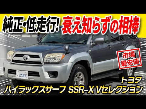 2009年式 トヨタ ハイラックスサーフ SSR-X Vセレクションの登場です! 近年では市場で見かけること自体が少なくなったハイラックスサーフ。その中でも本車両は走行距離7万km台と、この年代としてはかなり低走行な一台です。さらに、多くの車両がリフトアップや外装カスタムを施されている中で、この個体は貴重なフルノーマルコンディションをキープ。オリジナルのスタイルを大切にしたい方や、今後自分好みに仕上げていきたい方にもおすすめです。大切に扱われてきた雰囲気が感じられる一台で、年式を考えると非常に状態の良いサーフだと思います。 是非この機会にご検討ください!