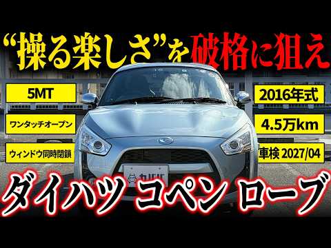 【魅力装備】 ・デジタルインナーミラー(ドラレコ機能付き) ・ワンタッチオープン機能化 ・左右ウィンドウ同時閉鎖化 ・シートヒーター ・純正ナビ(Bluetooth/TV/CD・DVD機能など) ・ETC車載器 【車両概要】 軽オープンスポーツの代表格、2016年式 ダイハツ コペン ローブが登場です。 電動開閉ルーフを備え、クーペの快適性とオープンの爽快感を一台で楽しめるコペン。ローブは流麗で近代的なデザインが特徴の人気モデルで、日常使いからワインディングまで幅広く楽しめる一台です。 本車両は5速MTを採用。軽量ボディと相まって、ドライバーの操作に素直に応えるダイレクトな走行フィールを堪能できます。走行距離は約4.5万kmと程よいコンディションで、内外装ともに非常に綺麗な状態を維持されている点も魅力です。 オープンエアドライブの楽しさに加え、快適装備・実用装備も充実。趣味性と実用性を高い次元で両立した個体となっております。 【車両コンディション】 ■ガラスのキズ・状態 軽微な飛び石傷はありますが、車検に影響のある大きな破損なし。 ■外装 フロントまわり軽微な飛び石/Fバンパー下スリ,線キズ ホイール軽微なクリアハゲ/助手席ドアエッジ,右リアフェンダー小傷 ■エンジン音と振動 取材時のアイドリングは非常に安定しており、異音や不自然な振動は確認取れませんでした。 ■内装 シートに使用に伴う使用感がみられましたが張り状況も良好でした。 ■車内・エアコンのニオイ 清潔感のある車内を維持しており、タバコ臭・ペット臭など、不快なニオイは一切確認できませんでした。 《重要》購入前にご確認をよろしくお願いします。 ※本車両に対する予防整備(消耗品等)の不具合、劣化等に関しては免責事項となります。
