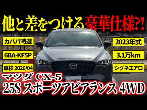 【車両おすすめ装備】 ⚫︎有償色:マシーングレープレミアムメタリック ⚫︎SIGNATURE STYLE エアロキット ・フロントアンダーガーニッシュ ・リヤアンダーガーニッシュ ⚫︎ブレーキキャリパーペイント(レッド) ⚫︎ウェルカムランプ ⚫︎純正デイライトキット ⚫︎純正ブルーミラー(親水) ⚫︎純正LEDアクセサリーランプ ⚫︎純正カーナビゲーション(マツコネSD付属) ⚫︎デジタルTV ⚫︎TVキャンセラー ⚫︎盗難防止システム:バーグラアラーム ⚫︎リモコンエンジンスターター(アンサーバック機能付き) ⚫︎フロアマット ⚫︎ラゲッジルームマット ⚫︎ドライブレコーダー ⚫︎ETC ⚫︎レーダー探知機 ⚫︎コーティング施工(新車時) 【本車両ならではの魅力】 スポーツアピアランスの引き締まったブラックパーツと相性抜群の有償色、マシーングレープレミアムメタリックのボディに加えて、純正エアロ、SIGNATURE STYLEが組み合わされることで、ノーマルとは一線を画すスポーティーな仕上がりとなっております。街中で走っているCX-5のほとんどはエアロ未装着ですので、他の人とは差別化したいという方にもぜひおすすめです。 装備面でも、デイライトキットやLEDアクセサリーランプ、ウェルカムランプなどが純正で統一され、トータルバランスが良く豪華に仕上がっております。リモコンエンジンスターターで季節を問わずに快適にご使用可能で、バーグラアラームも搭載のため防犯面も安心な点も魅力的です! 【車両情報】 「2023年式 マツダ CX-5 2.5 25S スポーツアピアランス 4WD」が登場です。 当車両は、スポーティーな専用装備が多数搭載された最上級グレード、「スポーツアピアランス」となります。 搭載される2.5L直列4気筒エンジンは、街中では滑らかで扱いやすく、高速道路では余裕ある加速を実現して、アクセルを踏み込んだ瞬間の素直なレスポンスは、毎日の通勤からロングドライブまでストレスを感じさせません。さらに、雨天時や雪道、未舗装道路でも安定感抜群な走りを見せてくれる4WDモデルであることも大きな魅力です。 エクステリアは、グリルやホイール、ドアミラーが光沢のあるブラック加飾が施され、SUVらしい力強さにスポーティーさが加わったスタイリングとなっております。 インテリアは、専用のレッドステッチ入りのブラックレザーシートが目を惹き、長時間の運転でも疲れにくい上質な乗り心地で日常使いからレジャーまで、幅広いシーンで活躍してくれる設計です。 【メンテナンス歴】 以下、ディーラーメンテナンス R5/10点検(2686km) R5/11点検(3781km) R6/4 点検(9346km) R7/5 点検(24180km) R7/10 点検(28155km) 【車両状態】 ⚫︎外装 フロントガラス、ボンネット、Fバンパーに小さな飛び石傷、右Rドアに小傷がございますが、全体的に綺麗な状態を維持されています。詳しくは掲載写真及び動画をご覧ください。 ⚫︎内装 シートにシワ等の使用感がございますが、全体的に綺麗な状態を維持されています。詳しくは掲載写真及び現車確認動画をご覧ください。 ⚫︎におい 当車両は禁煙車となっており、ペットのご乗車もないため、気になるにおいなどはございません。 【新車保証継承可能】 最寄りの正規ディーラーにて12ヶ月点検相当の法定点検(有償)を実施することにより、新車保証も継承可能なため個人売買ながらも安心してご購入いただけます。 またテレビキャンセラーが取り付けられているため新車保証継承できない可能性がございます。詳しくはお近くのディーラーにてご確認くださいませ。