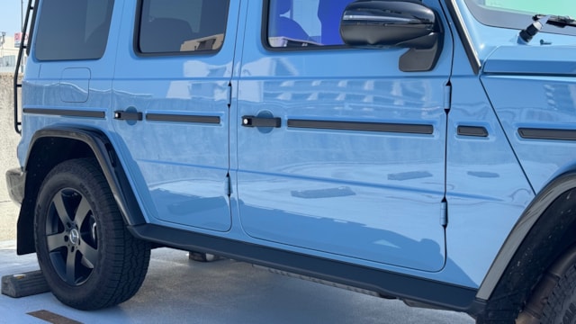 【G400d プロフェッショナルエディション専用装備】 ●専用カラー:ヴィンテージブルー ●ナイトパッケージ&ナイトパッケージ2 -ブラックアクセントパーツ:ホイールアーチ、フロントグリル、バンパー(フロント/リア)、スリーポインテッドスターエンブレム(フロント/リア)、モデルエンブレム(リア) -ブラックスモーク仕様:マルチビームLEDヘッドライト、リアコンビネーションランプ、ウィンカーライト ●プロフェッショナルラインエクステリア -18インチ5スポークブラックペイントアルミホイール+オールテレインタイヤ -マッドフラップ -ランニングボードレス ●プロフェッショナルルーフラック+ラダー ●プロフェッショナルスペアタイヤホルダー ●ラグジュアリーパッケージ -ガラススライディングルーフ(挟み込み防止機能付) -Burmesterサラウンドサウンドシステム(スピーカー数:15) ●エクスクルーシブナッパレザーシート(ダイヤモンドステッチ付) ●専用ステッチカラー:ブルー ●フルレザー仕様 ●リラクゼーション機能[前席] ●シートベンチレーター[前席] ●アクティブマルチコントロールシートバック[前席] ●シートヒータープラス[前席] ●電動ランバーサポート[前席] ●ドライビングダイナミックシート[前席] ●ステアリングヒーター ●レザーDINAMICAルーフライナー ●ブラックピアノラッカーウッドインテリアトリム ●チェリーウッドラゲッジフロア ●アダプティブダンピングシステム 【その他】 ・ゴーストフィルム(UVカット) [フロントガラス/前席ガラス 計3面] ・純正ドライブレコーダー Gクラス伝統のスクエアなボディに、プロフェッショナルエディションならではのシンプルで実用的な装備を備えた、500台限定の特別仕様車「メルセデス・ベンツ Gクラス G400d プロフェッショナルエディション」が、今回カババに出品されました! 搭載するのは、3.0L直列6気筒ディーゼルエンジン(330PS/700Nm)。 低回転域から発揮される強力なトルクにより、悪路走破性を高めたオフロード性能を誇るモデルです。 エクステリアも、実用性を強く意識したオフロードテイストで仕上げられています。 Gクラスならではの高級感を保ちながら、専用カラーや専用ルーフラック、スペアタイヤカバーによって無骨さをしっかりと演出しています。 さらにインテリアには、ダイヤモンドステッチが美しいエクスクルーシブナッパレザーシートを採用。 ラゲッジルームには本物の桜の木を使用したチェリーウッドラゲッジフロアを備え、シートにはマッサージ機能も搭載。 まさに“ハイクラスオフロードユース”にふさわしい一台に仕上がっています! 【新車保証継承可能】 最寄りの正規ディーラーにて12ヶ月点検相当の法定点検(有償)を実施することにより新車保証も継承可能なため個人売買ながらも安心してご購入いただけます! 【車両状態】 右Rフェンダーに保護フィルムの上からの薄傷/小傷が見られますが、内外装ともに目立ったマイナスポイントは見られませんでした。 においに関しても禁煙車のため気になるものは感じられませんでした。