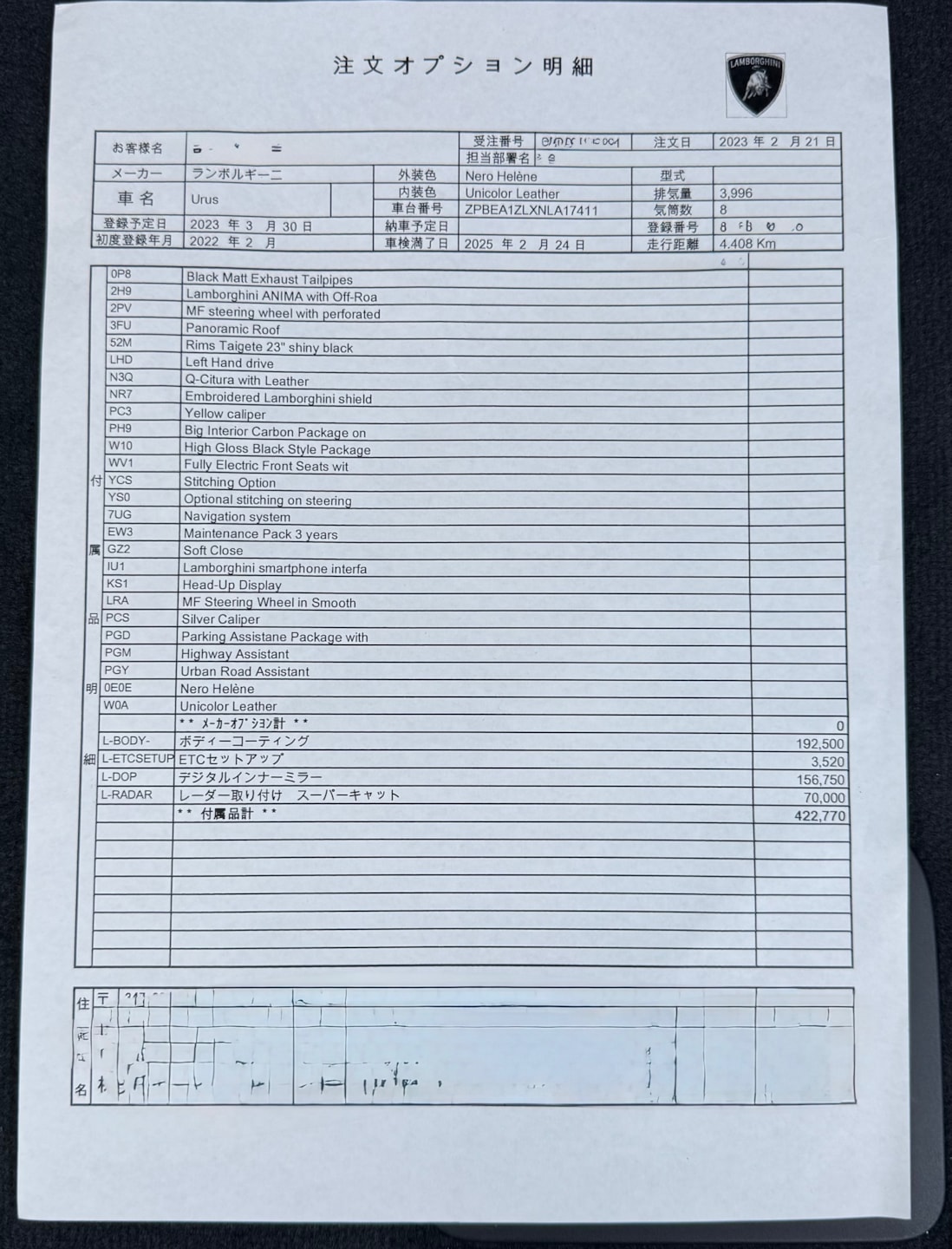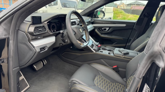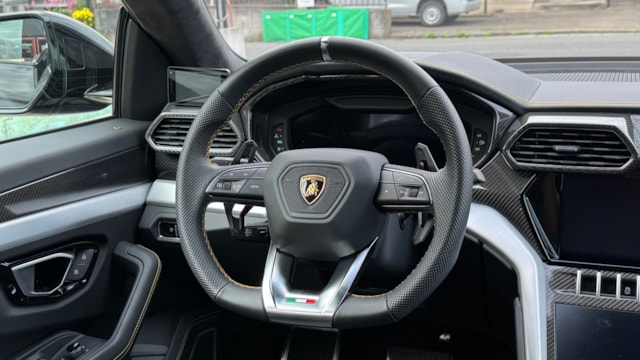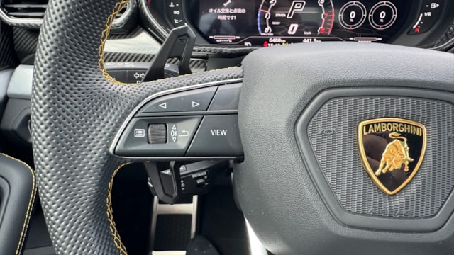 【車両オプション装備】 ■エクステリア・パフォーマンス • 外装色:Nero Helene(ネロ・ヘレーヌ) • Rims Taigete 23インチ(シャイニーブラック) • ハイグロスブラックスタイルパッケージ • ブラックマット・エキゾーストテールパイプ • イエローキャリパー / シルバーキャリパー • パノラミックルーフ • ランボルギーニ ANIMA(オフロードモード付) ■インテリア・快適装備 • Q-Citura with Leather(キルティングレザー内装) • ビッグインテリアカーボンパッケージ • フル電動フロントシート • 刺繍入りランボルギーニシールド(ヘッドレスト) • ステッチングオプション(ステアリング含) • ソフトクローズドア • デジタルインナーミラー ■テクノロジー・安全支援 • ヘッドアップディスプレイ • ハイウェイアシスタント & アーバンロードアシスタント • パーキングアシスタンスパッケージ • ランボルギーニ スマートフォンインターフェース • レーダー探知機(スーパーキャット) / ドライブレコーダー 【この車両のアピールポイント】 2022年2月登録、ランボルギーニ「ウルス」が出品しました!!4.0L V8ツインターボエンジンを搭載し、スーパーカーの魂とSUVの利便性を高次元で融合させた一台です。 コーンズの認定中古車として購入され、コーンズにてコーティングを施工。その後も屋内保管にて大切に維持されてきました。 記録簿もしっかりと残っており、走行距離わずか4,400km台という低走行個体で外装色は漆黒の「ネロ・ヘレーヌ」を纏い、23インチの光沢ブラックホイールやハイグロスブラックスタイルパッケージにより、圧倒的な存在感を放つコンディション良好な車両です。 この車両のオススメポイント! 「カーボンパッケージにパノラマルーフ、充実の運転支援を備えた珠玉の豪華オプション仕様」 本車両の魅力は、画像明細にある通りの贅沢なオプション構成にあります。 内装には「ビッグインテリアカーボンパッケージ」と「Q-Cituraレザー」を採用し、ランボルギーニらしいスポーティーかつ豪華な空間を演出。開放感あふれるパノラマルーフやソフトクローズ、ヘッドアップディスプレイといった快適装備に加え、都市・高速道路の両面でサポートする最新の運転支援パッケージも網羅しています。 購入元の認定中古車由来の安心感と、これ以上ないほどの装備内容が共存する、まさにウルスの醍醐味を凝縮したパッケージです。 【気になる車両の状態】 ■車内・エアコンのニオイ エアコンの吹き出し口からの臭いに関しては、不快な臭いは感じられませんでした。 ■エンジン始動と振動 取材時エンジンの始動や不穏な振動、現状の設備に不具合や異音などは確認取れませんでした。 ※取材時はタイヤの空気圧の点検ランプが点灯 ■ガラスのキズ・状態 取材時、特に傷は見当たりませんでした。 ■車両状態 左リアアルミに微小の飛び石があります。 その他は全体的に大きな傷や損傷などは見受けられず、評価点も5点を獲得できるレベルとなっており、内装は当然タバコの臭いや不快な臭いが無く、禁煙車である点も安心ポイントで比較になる中古車と比べても非の打ち所がない一台です。 【過去の整備記録】 ■2023年3月(4,421km) 保証継承点検 ■2024年2月(5,431km) 一年点検 ■2025年2月(5,965km) 車検点検 お問い合わせをお待ちしております! お車のクオリティや動画での詳細な状態(査定スタッフの見解、タイヤのヒビなど)が気になる方は、どうぞお気軽にお問い合わせください!お客様のオンライン購入をサポートいたします!