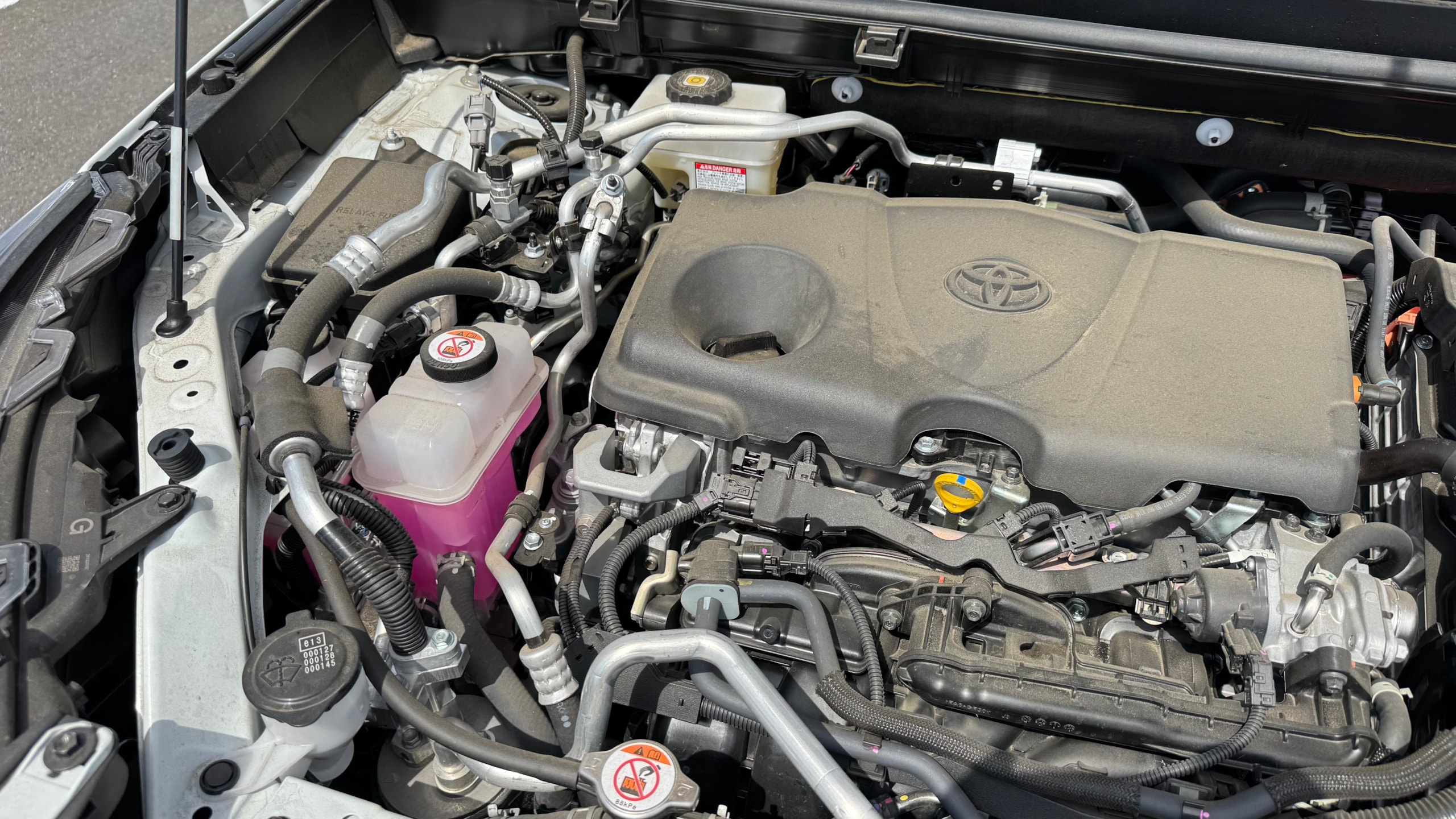 ■2024年式 トヨタ RAV4 エンジン型式 A25A-FXS 最高出力 177ps(130kW)/6000rpm 最大トルク 22.3kg・m(219N・m)/3600rpm 種類 直列4気筒+モーター 総排気量 2487cc 内径X行程 87.5mm×103.4mm 圧縮比 ---- 過給機 なし 燃料供給装置 筒内直接+ポート燃料噴射装置(D-4S) 燃料タンク容量 55リットル 使用燃料 無鉛レギュラーガソリン