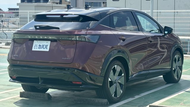 【装備一覧】 ・スタイリッシュパッケージ シーケンシャルドアミラーウィンカー フロントグリルイルミネーション ・3m 200V充電コード ・プロパイロット2.0 ・BOSEサウンド ・パノラマガラスルーフ 【車両概要】 2024年式 日産 アリア B9 e-4ORCE リミテッド。日産の電動SUVフラッグシップに位置づけられるモデルで、大容量バッテリーを搭載したB9に、前後モーターによるe-4ORCE(電動4WD)を組み合わせた高出力仕様です。加速性能だけでなく、前後トルク配分による安定したコーナリングと高い直進安定性が特徴。さらに上級グレードのリミテッドでは快適装備も充実しており、長距離移動から日常使いまで高い完成度を持つ1台です。 【本車両のここがおすすめ】 スタイリッシュパッケージ装着により、シーケンシャルドアミラーウィンカーやフロントグリルイルミネーションが加わり、夜間の存在感や先進性をしっかり演出している点は見逃せません。さらにプロパイロット2.0を搭載しているため、高速走行時の運転支援性能も非常に高く、長距離ドライブでの負担軽減にも寄与します。BOSEサウンドやパノラマガラスルーフといった快適装備も揃っており、EVらしい静粛性と相まって移動空間としての質も高い仕上がりです。ボディカラーはバーガンディ×ブラックルーフの組み合わせで、上質かつ個性のある仕上がり。加えてワンオーナー・屋内保管という使用環境もポイントで、コンディション重視で探している方にとっては条件の整った個体と言えます。 【車両状態】 左ドアミラーに小傷/助手席シート座面、肘置きに 汚れ 中古車ですので軽微な汚れはありますが、大きな傷や破損等はない状態を維持されております。 また、禁煙車かつペット乗車歴もなく、不快な匂いはございません。 新車保証継承可能 最寄りの正規ディーラーにて12ヶ月点検相当の法定点検(有償)を実施することにより新車保証も継承可能なため個人売買ながらも安心してご購入いただけます! 自動車税 免税対象地域以外のお住まいの方が購入される場合、自動車税が発生することがございます。ご了承下さい。