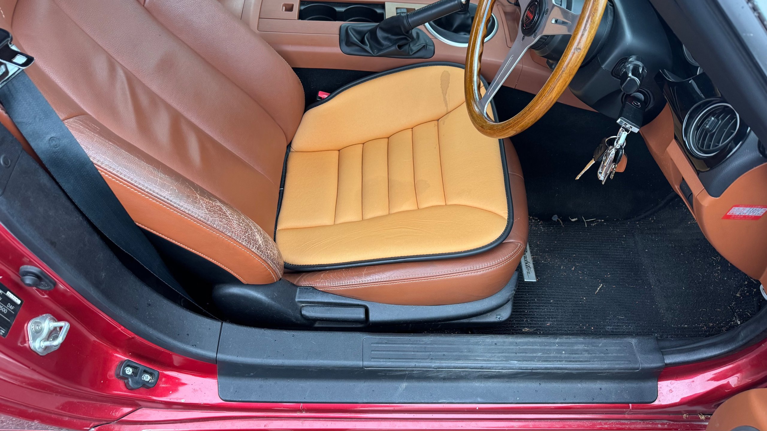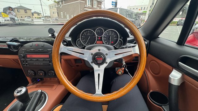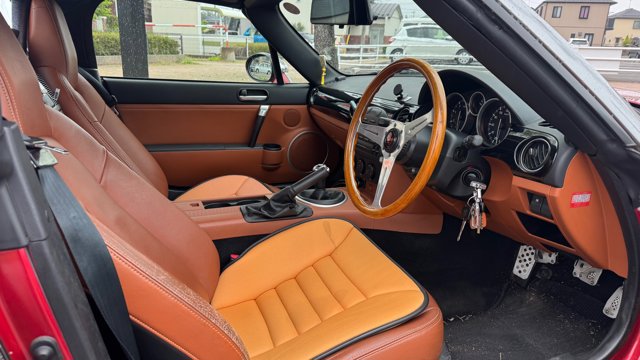 マツダ・ロードスターの楽しさはそのままに、他とは絶対に被らない個性を求める方に「モノクラフトMH1」は最高の選択肢です。 円形ヘッドライトを特徴とするこのキットは、単なるドレスアップを超えた完成度の高さを誇ります。 内装のサドルタンレザーは適度な使用感こそありますが、MOMOステアリングへの変更など、オーナー様の手によって「クラシック・スポーツ」というコンセプトが徹底されています。 7.5万キロという距離も、この年式のロードスターとしてはこれからが本番と言える範囲。自動車税も込みという好条件で、この希少なスタイリングを公道で走らせる悦びをぜひ味わってください。
