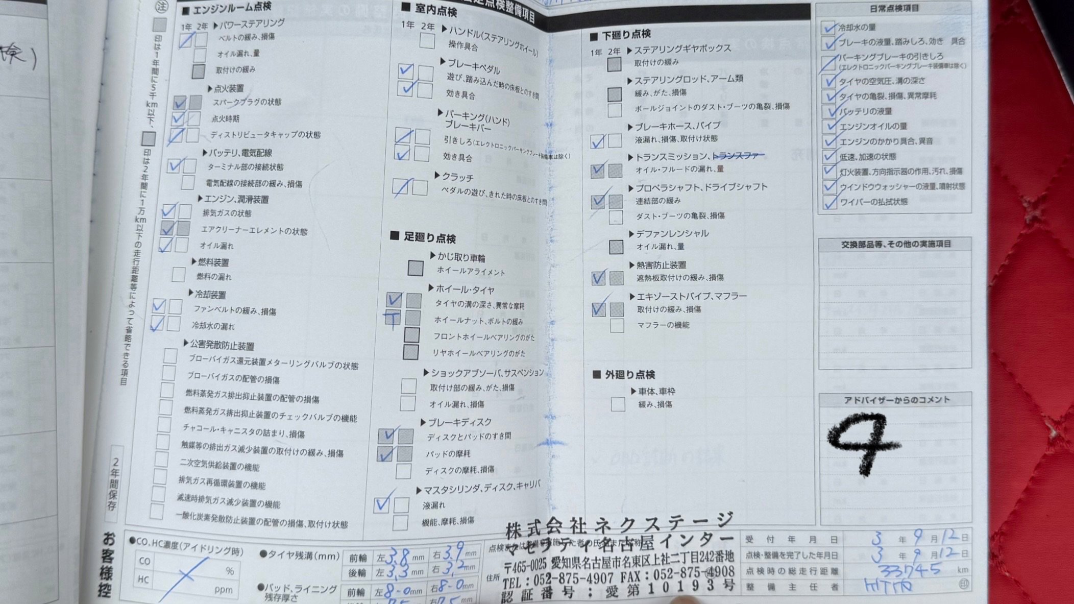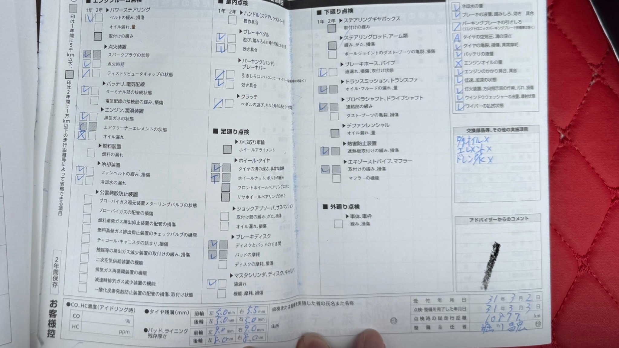 | ブレーキパッドの状態 | 令和7年点検時(57678Km)フロント:4ミリ リア:6ミリ |